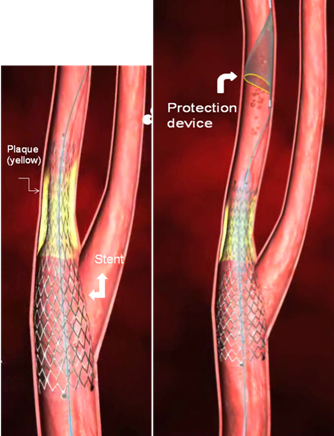 - Filter protection devices are umbrella-shaped devices that are placed temporarily in the internal carotid artery beyond the site of stenosis during the procedure. These devices have small pores designed to exclude particulate debris embolization to cranial circulation during the procedure.